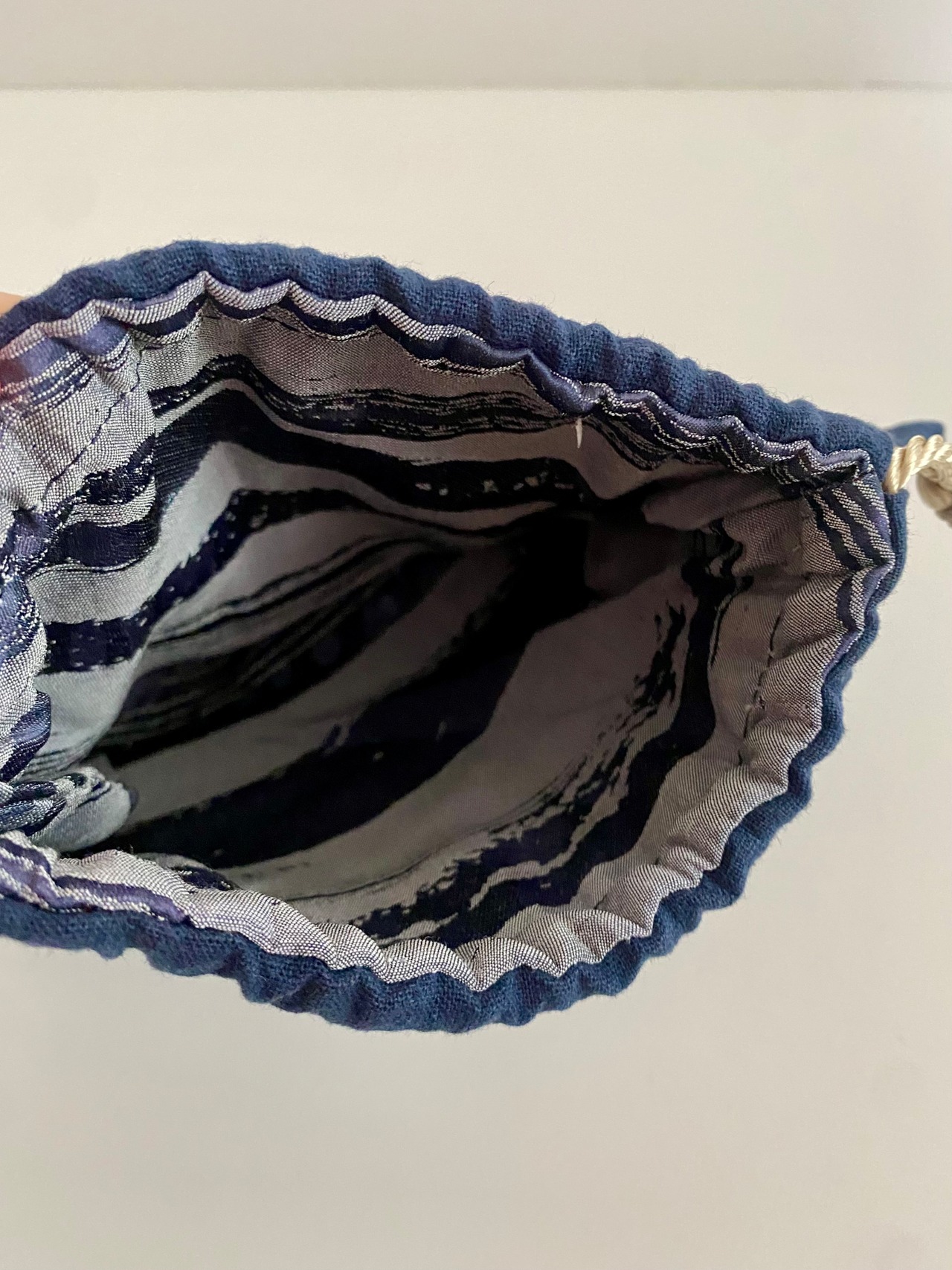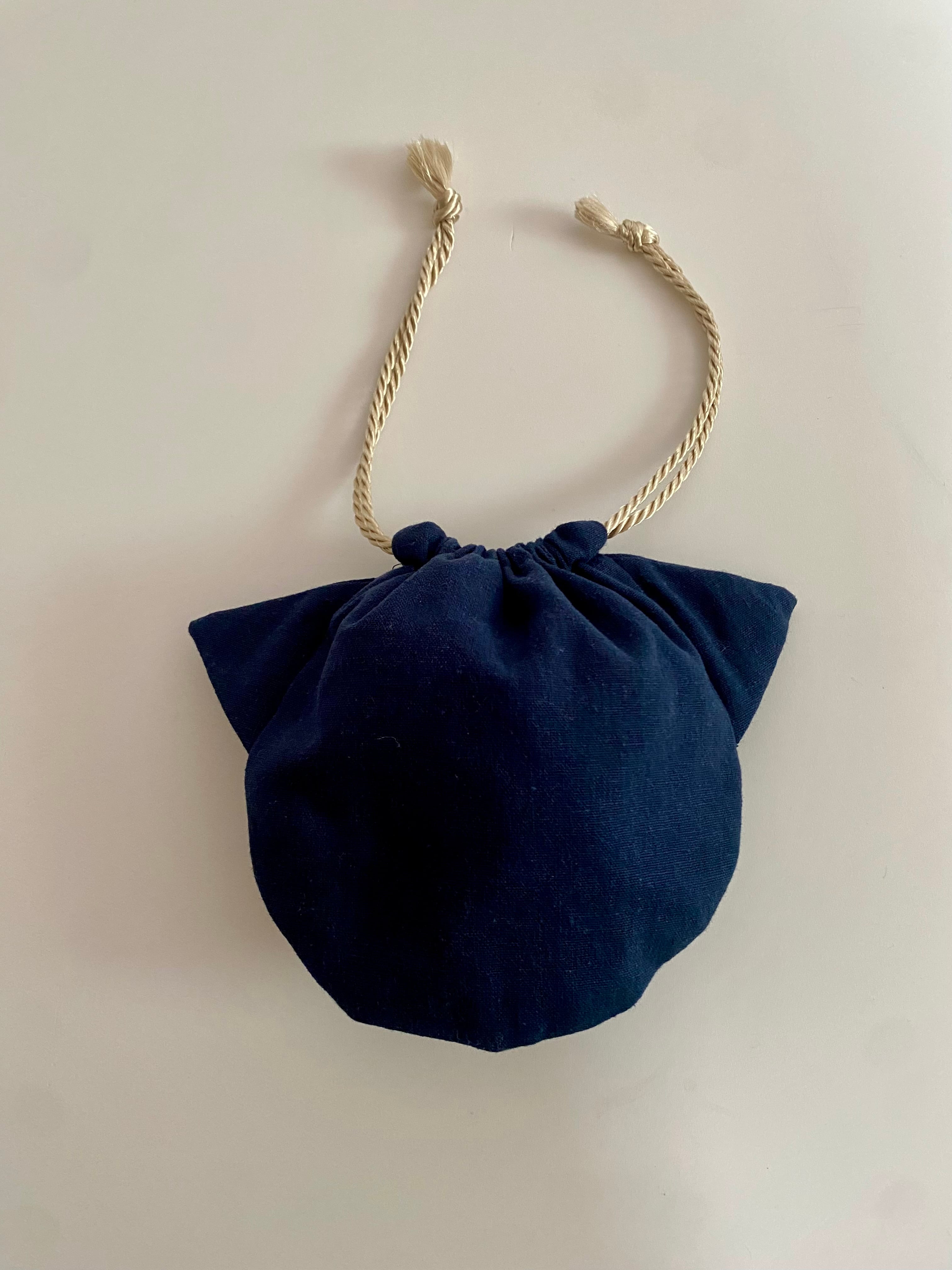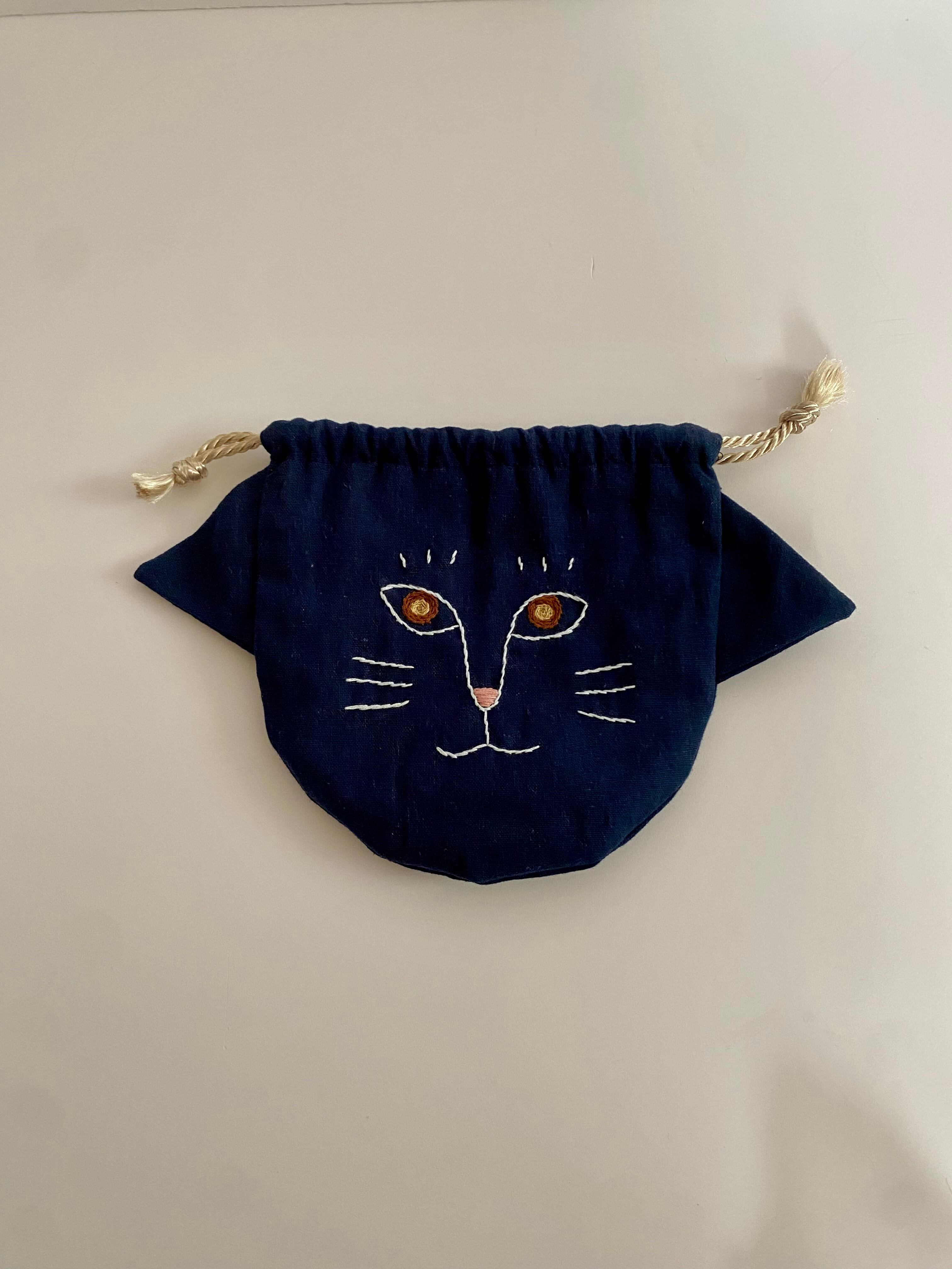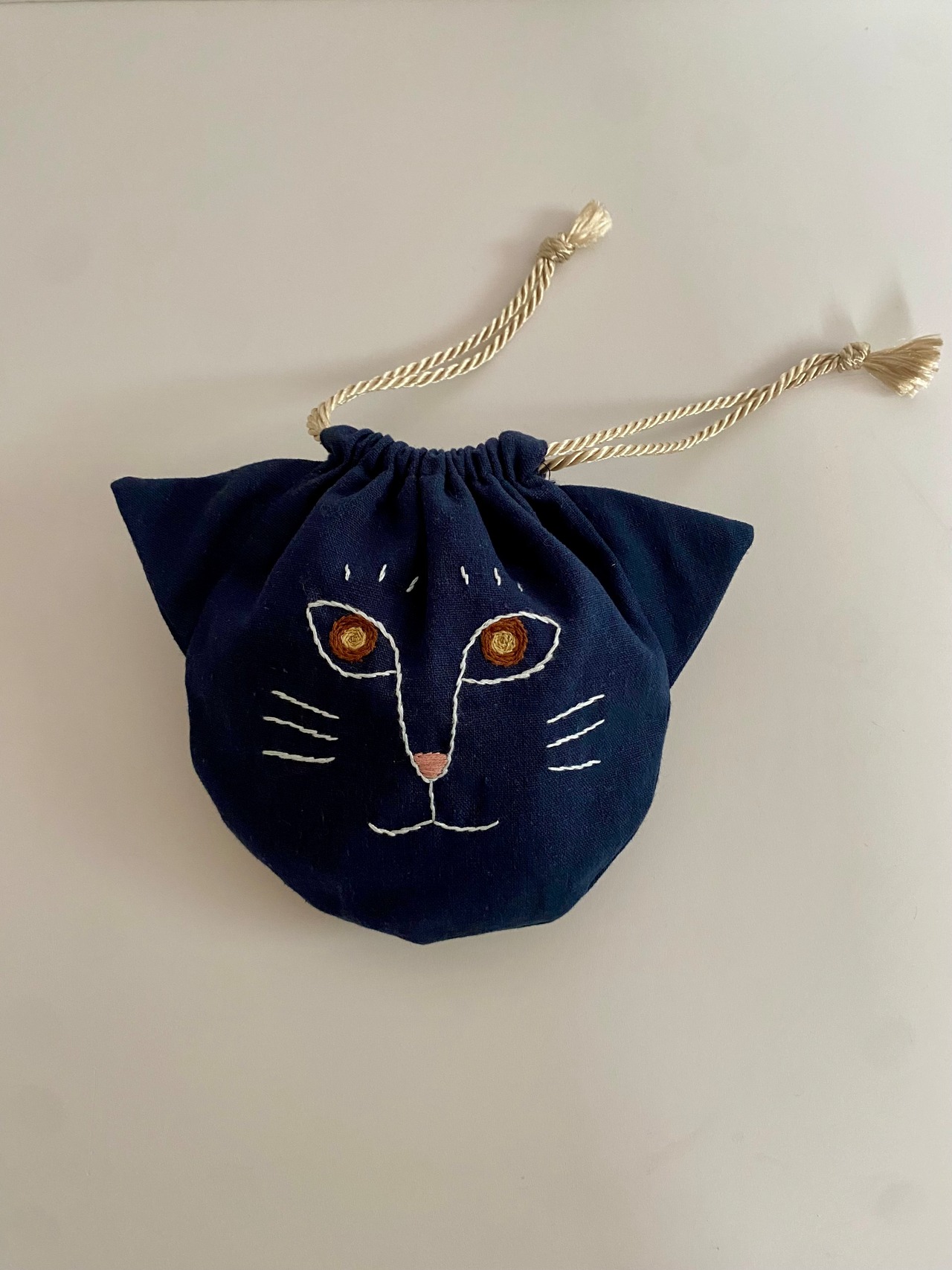ブラウンとベージュの目を刺繍した猫巾着です。